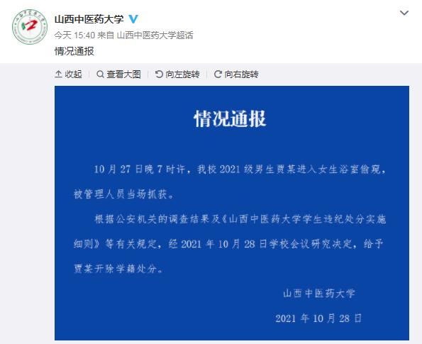 10月28日,有网友反映,10月27日晚上山西中医药大学女生浴室有男生混入,此前还发生过类似事件。针对此事,山西中医药大学官方微博28日通报称,27日19时许,该校2021级男生贾某进入女生浴室偷窥,被管理人员当场抓获。根据公安机关的调查结果及《山西中医药大学学生违纪处分实施细则》等有关规定,经2021年10月28日学校会议研究决定,给予贾某开除学籍处分。