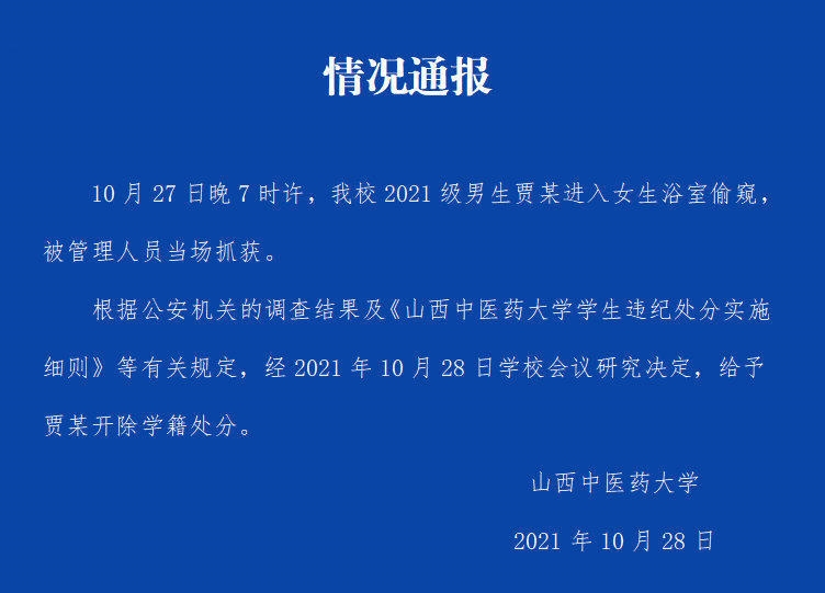 10月28日,山西中医药大学官方微博发布通报称,10月27日晚19时许,该校2021级男生贾某进入女生浴室偷窥,被管理人员当场抓获。根据公安机关的调查结果及《山西中医药大学学生违纪处分实施细则》等有关规定,经2021年10月28日学校会议研究决定,给予贾某开除学籍处分。