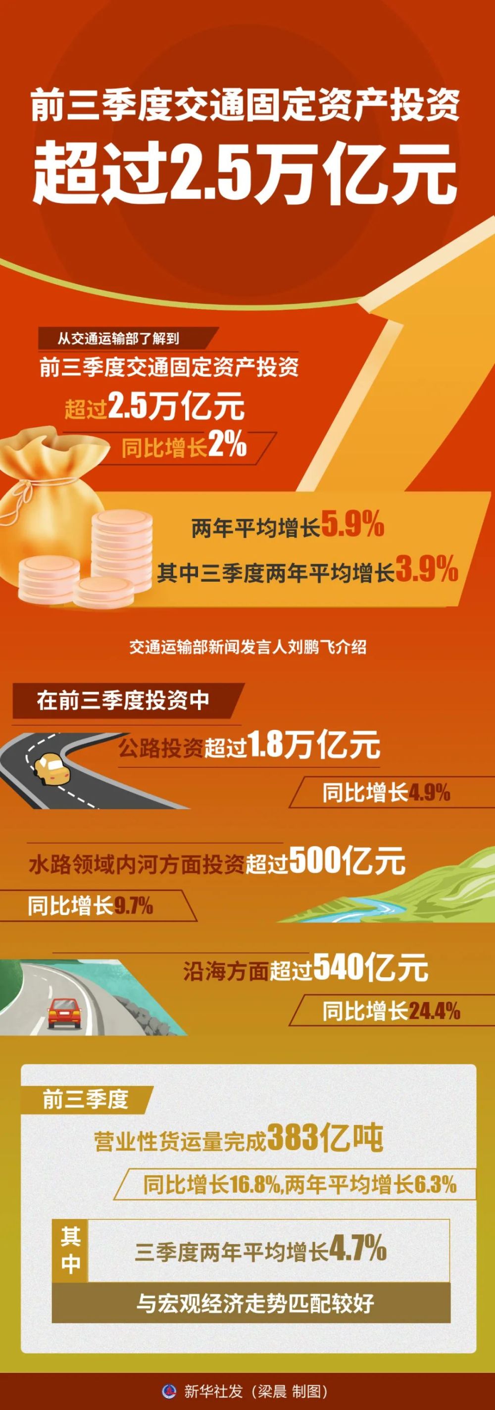 交通运输部消息,前三季度交通固定资产投资超过2.5万亿元,同比增长2%,两年平均增长5.9%,其中三季度两年平均增长3.9%。