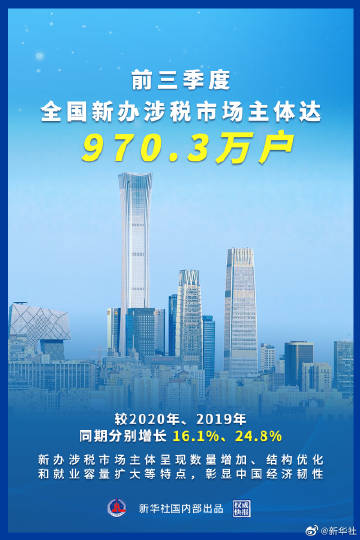【权威快报|#前三季度全国新办涉税市场主体超970万户#】国家税务总局29日发布数据显示,前三季度全国新办涉税市场主体达970.3万户,较2020年、2019年同期分别增长16.1%、24.8%,两年平均增长11.7%。新办涉税市场主体呈现数量增加、结构优化和就业容量扩大等特点,彰显中国经济韧性。(记者王雨萧、申铖,海报设计杨轶群)
