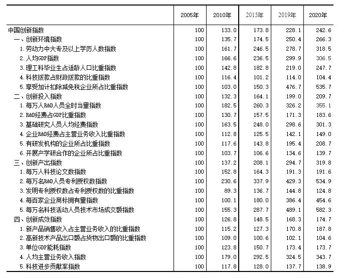 央视网消息:据国家统计局网站消息,据国家统计局社科文司《中国创新指数研究》课题组测算,2020年中国创新指数达到242.6(以2005年为100),比上年增长6.4%。分领域看,创新环境指数、创新投入指数、创新产出指数和创新成效指数分别达到266.3、209.7、319.8和174.7,分别比上年增长6.3%、5.4%、8.5%和3.8%。测算结果表明,2020年,我国创新能力和水平保持持续提升,创新环境不断优化,创新投入继续增加,创新产出较快增长,创新成效进一步显现。