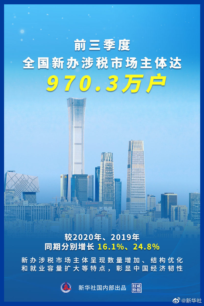国家税务总局29日发布数据显示,前三季度全国新办涉税市场主体达970.3万户,较2020年、2019年同期分别增长16.1%、24.8%,两年平均增长11.7%。新办涉税市场主体呈现数量增加、结构优化和就业容量扩大等特点,彰显中国经济韧性。(记者王雨萧、申铖,海报设计杨轶群)
