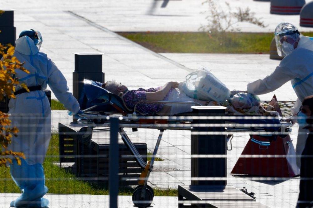 10月11日,在俄罗斯莫斯科市郊科穆纳尔卡一家医院,穿防护服的医护人员将病患送进医院。(新华社发,亚历山大摄)