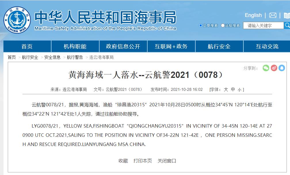 央视网消息:据国家海事局网站消息,云航警0078/21,据报,黄海海域,渔船“琼昌渔20315”2021年10月28日0500时从概位34°45′N 120°14′E处航行至概位34°22′N 121°42′E处1人失踪,请过往船舶协助搜寻。