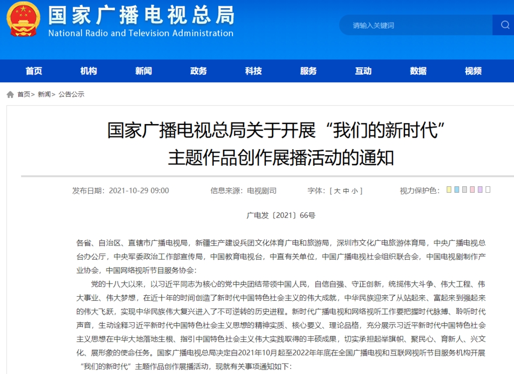 党的十八大以来,以习近平同志为核心的党中央团结带领中国人民,自信自强、守正创新,统揽伟大斗争、伟大工程、伟大事业、伟大梦想,在近十年的时间创造了新时代中国特色社会主义的伟大成就,中华民族迎来了从站起来、富起来到强起来的伟大飞跃,实现中华民族伟大复兴进入了不可逆转的历史进程。新时代广播电视和网络视听工作要把握时代脉搏、聆听时代声音,生动诠释习近平新时代中国特色社会主义思想的精神实质、核心要义、理论品格,充分展示习近平新时代中国特色社会主义思想在中华大地落地生根、指引中国特色社会主义伟大实践取得的丰硕成果,切实承担起举旗帜、聚民心、育新人、兴文化、展形象的使命任务。国家广播电视总局决定自2021年10月起至2022年年底在全国广播电视和互联网视听节目服务机构开展“我们的新时代”主题作品创作展播活动,现就有关事项通知如下: