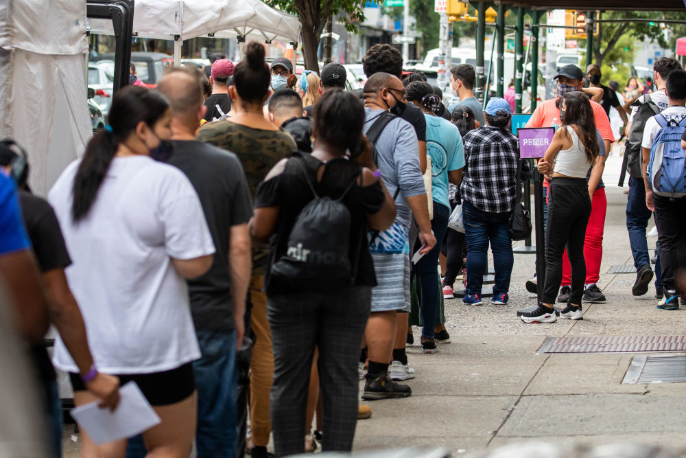 8月23日,人们在美国纽约一个新冠疫苗接种点排队等候接种辉瑞疫苗。(新华社发,郭克摄)