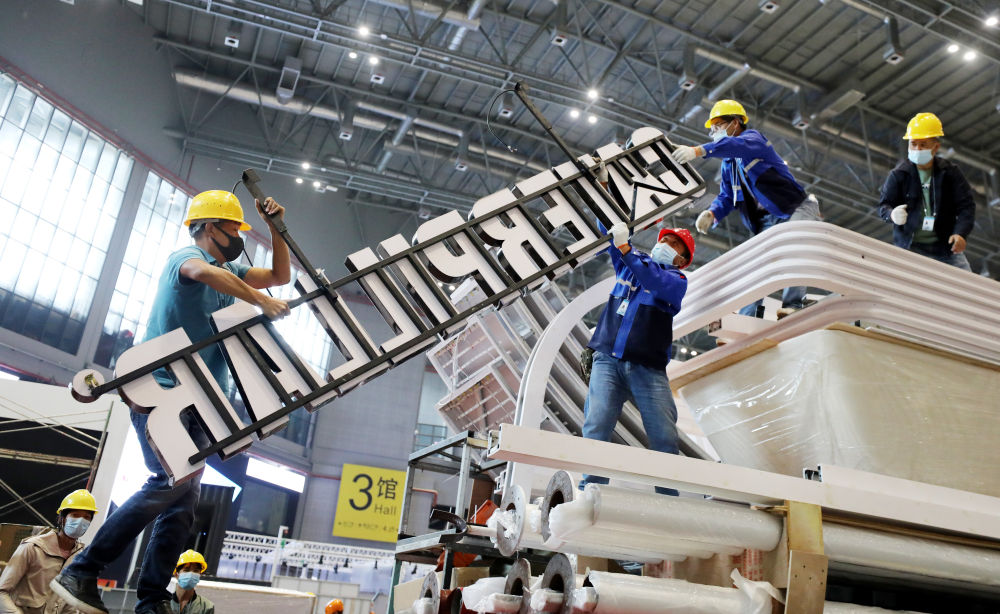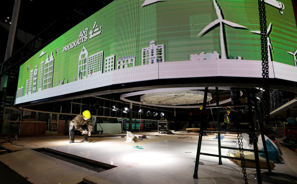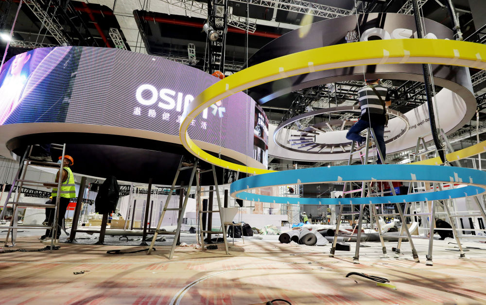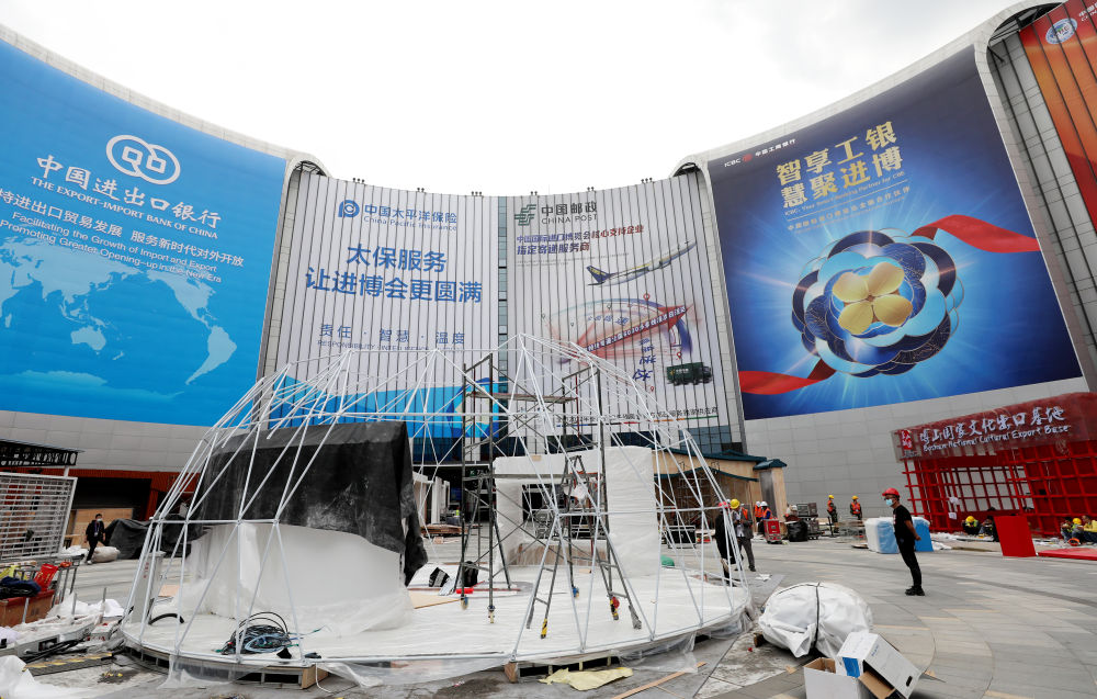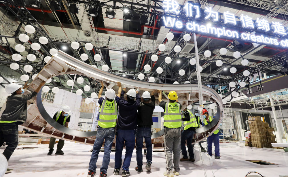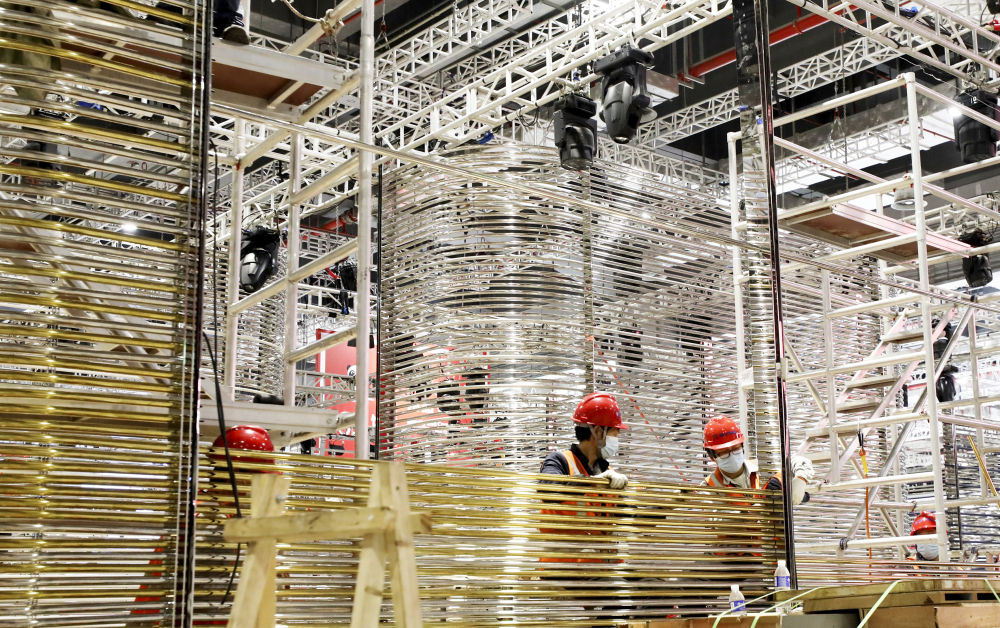 ↑10月29日,施工人员在国家会展中心(上海)中央广场搭建展台。