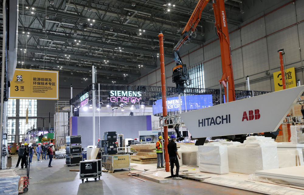 ↑10月29日,在第四届进博会的技术装备展区,施工人员在能源低碳及环保技术专区搭建展台。