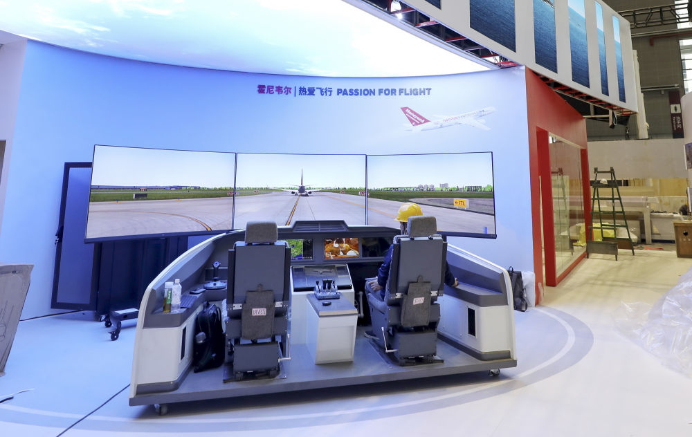 ↑10月29日,一位技术人员在第四届进博会的布展现场调试电子设备。