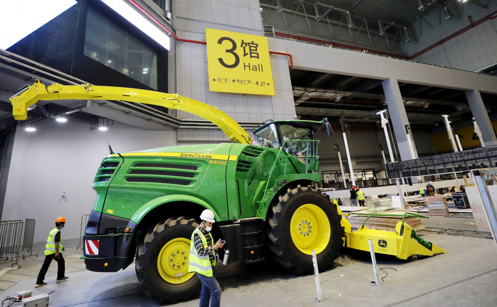 ↑10月29日,在第四届进博会的技术装备展区,施工人员从一辆大型农用机械旁走过。