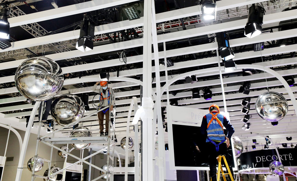 ↑10月29日,施工人员在第四届进博会的消费品展区搭建展台。