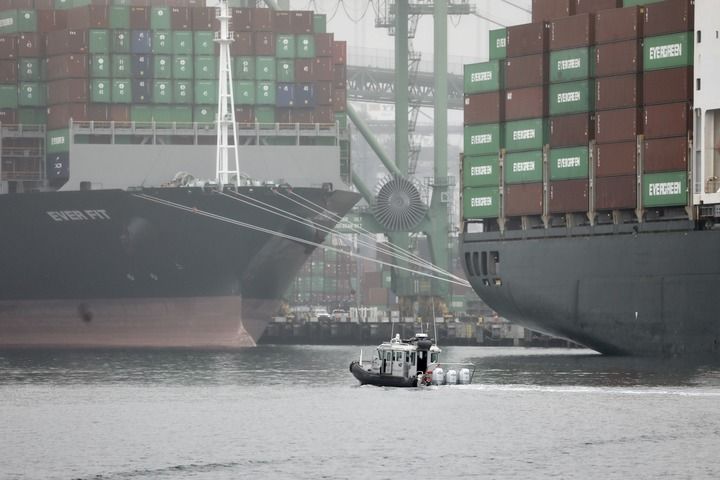 这是10月22日在美国加利福尼亚州洛杉矶港拍摄的集装箱货轮。新华社发