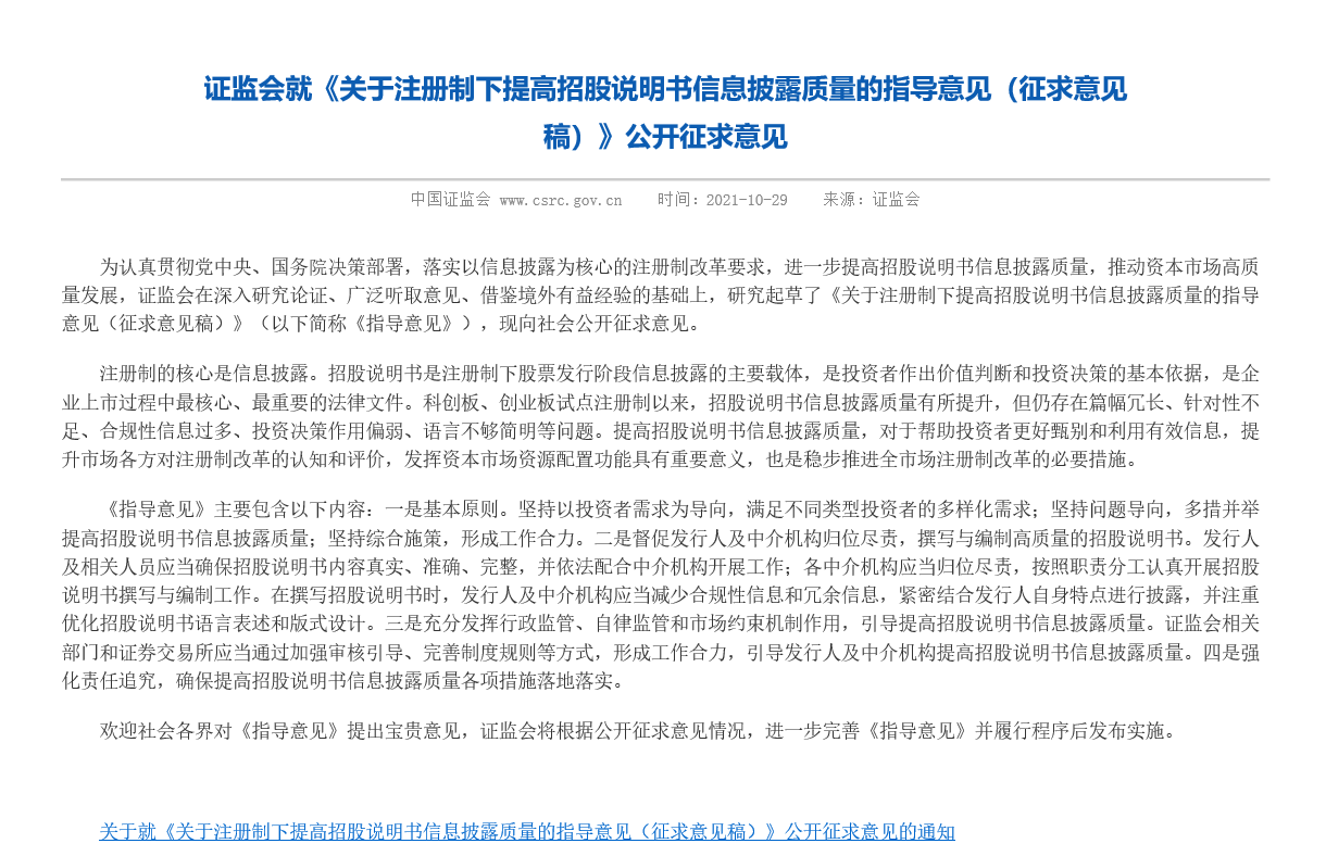 据证监会网站10月29日消息,为认真贯彻党中央、国务院决策部署,落实以信息披露为核心的注册制改革要求,进一步提高招股说明书信息披露质量,推动资本市场高质量发展,证监会在深入研究论证、广泛听取意见、借鉴境外有益经验的基础上,研究起草了《关于注册制下提高招股说明书信息披露质量的指导意见(征求意见稿)》(以下简称《指导意见》),现向社会公开征求意见。