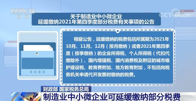 央视网消息:为支持制造业中小微企业发展,促进工业经济平稳运行,财政部、国家税务总局昨天(10月29日)发布公告,明确制造业中小微企业,包括个人独资企业、合伙企业、个体工商户,延缓缴纳2021年第四季度部分税费。