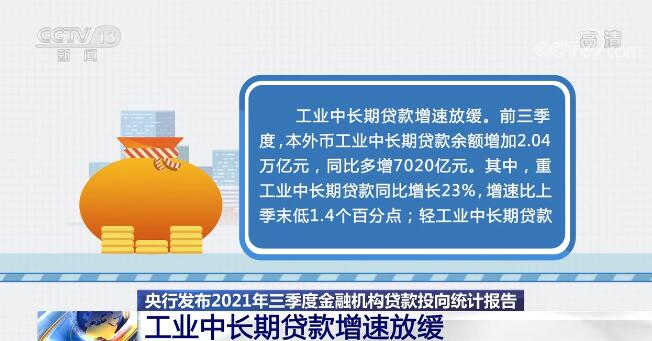 工业中长期贷款增速放缓。前三季度,本外币工业中长期贷款余额增加2.04万亿元,同比多增7020亿元。其中,重工业中长期贷款同比增长23%,增速比上季末低1.4个百分点;轻工业中长期贷款同比增长31.7%,增速比上季末低3.5个百分点。