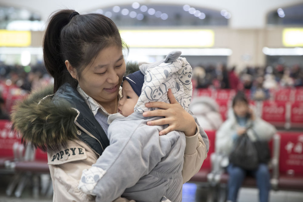 资料图片:一位母亲抱着孩子返乡。新华社记者张涛摄