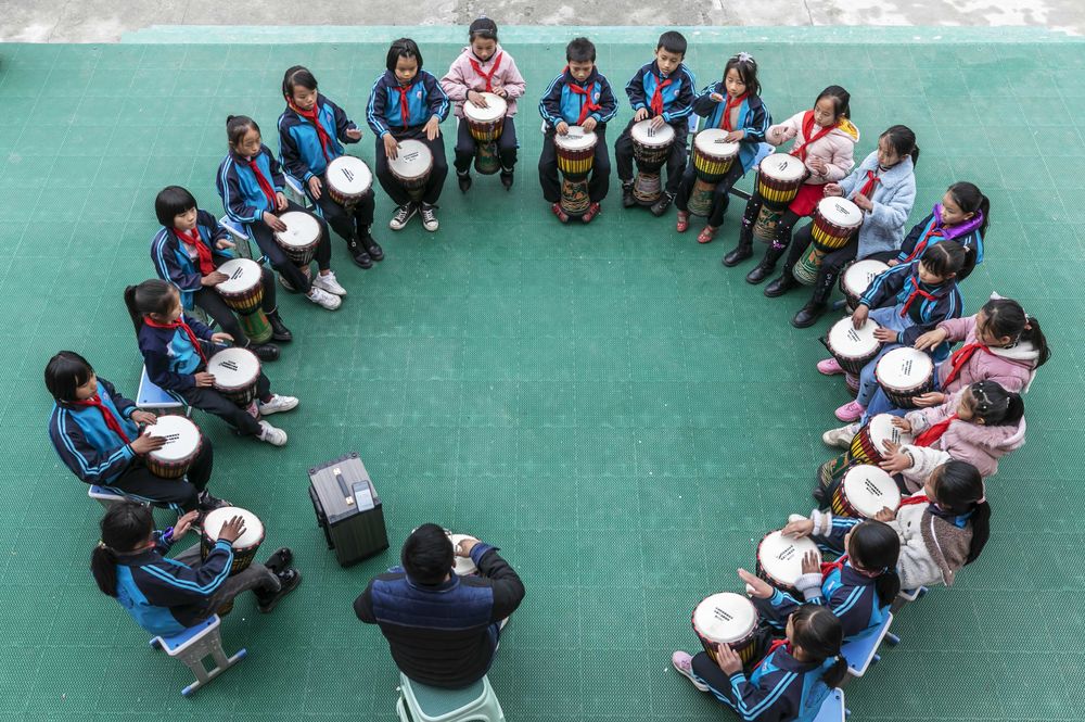 10月22日,贵州省黔西市林泉镇高锦小学学生在练习手鼓。新华社发(范晖摄)