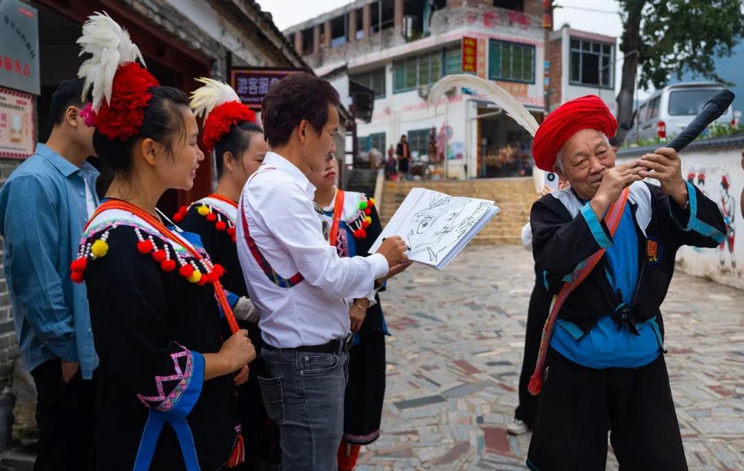 而今,在油岭歌堂前,许鸿飞见到了当年办展时的朋友们,大家穿盛装、拍长鼓、吹牛角、吹唢呐,欢歌载舞,来欢迎这位老朋友。许鸿飞与大家抽烟、聊天、看画册,一起回忆当年的情况,诉说近年的变化,以及对未来的设想。
