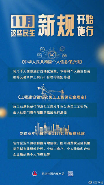 【权威快报|#一批民生新规11月起施行#】11月起,一批重要民生新规开始生效。其中,#个人信息保护法11月1日起正式施行#,对过度收集个人信息、大数据杀熟、滥用人脸识别技术等问题作出规制。此外,制造业中小微企业11月起可缓缴税款,工程建设领域实行农民工工资保证金制度……戳大图了解!(记者白阳,海报设计张晨光)