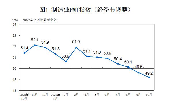 10月份,中国制造业采购经理指数(PMI)为49.2%,比上月下降0.4个百分点,继续低于临界点,制造业景气度有所减弱。