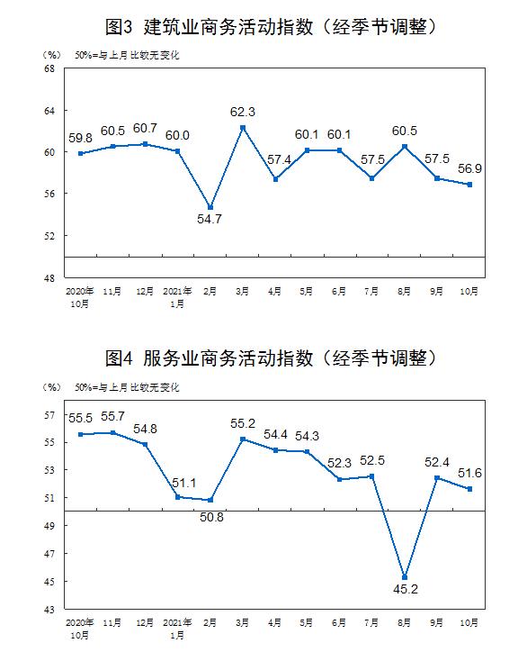 分行业看,建筑业商务活动指数为56.9%,比上月下降0.6个百分点。服务业商务活动指数为51.6%,比上月下降0.8个百分点。从行业情况看,住宿、餐饮、电信广播电视及卫星传输服务、互联网软件及信息技术服务、货币金融服务、生态保护及环境治理、文化体育娱乐等行业商务活动指数位于55.0%以上较高景气区间;资本市场服务、保险、房地产、居民服务等行业商务活动指数低于临界点。