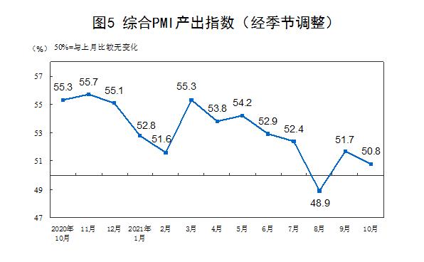 10月份,综合PMI产出指数为50.8%,比上月下降0.9个百分点,表明我国企业生产经营活动总体扩张步伐有所放缓。