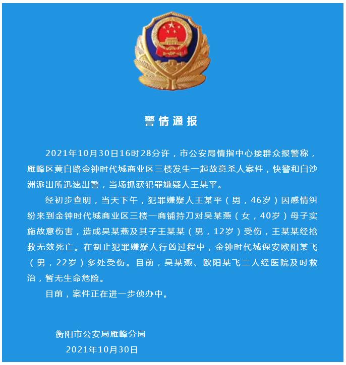 据湖南衡阳市公安局雁峰分局发布的消息,2021年10月30日16时28分许,市公安局情指中心接到群众报警称,雁峰区黄白路金钟时代城商业区三楼发生一起故意杀人案件,快警和白沙洲派出所迅速出警,当场抓获犯罪嫌疑人王某平。警方通报一起故意杀人案:男子因情感纠纷,持刀在某商铺对一对母子实施故意伤害,12岁儿子抢救无效死亡。一名保安在制止时多处受伤。