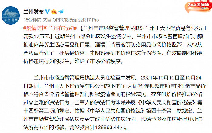 兰州市市场监督管理局执法人员在检查中发现,2021年10月19日至10月24日期间,兰州正大卜蜂贸易有限公司旗下的“正大优鲜”连锁超市销售的生猪产品价格不符合省价格监督管理部门新冠疫情期间的指导意见,存在哄抬价格推动价格过高上涨的违法行为。当事人的违法行为涉嫌违反《中华人民共和国价格法》第十四条第三项的规定,依据《中华人民共和国价格法》第四十条第一款规定,兰州市市场监督管理局依法责令其改正价格违法行为,拟给予没收违法所得并处违法所得五倍的罚款,罚没款合计128863.44元。