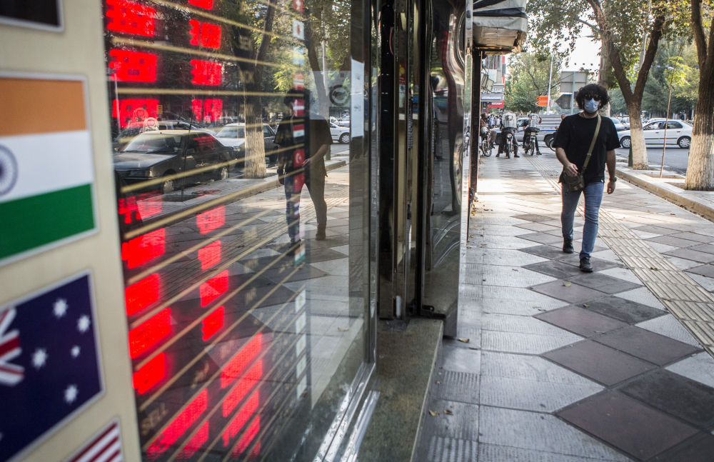 2020年10月14日,一名男子走过伊朗德黑兰一处外币兑换所。新华社发(艾哈迈德·哈拉比萨斯摄)