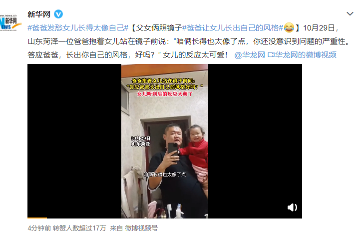 10月29日,山东菏泽一位爸爸抱着女儿站在镜子前说:“咱俩长得也太像了点,你还没意识到问题的严重性。答应爸爸,长出你自己的风格,好吗?” 女儿的反应太可爱!