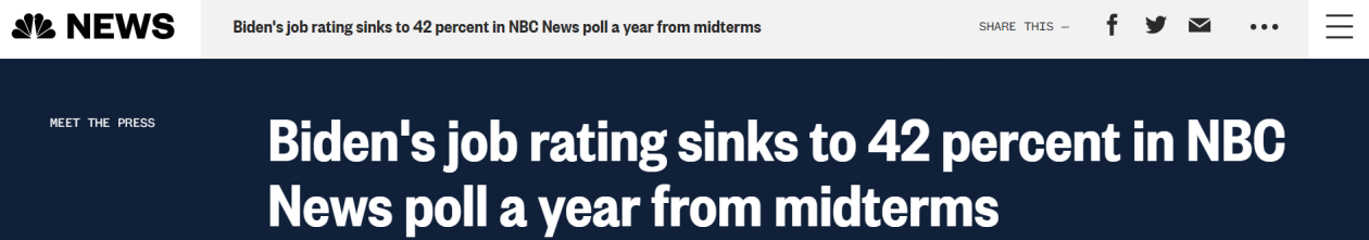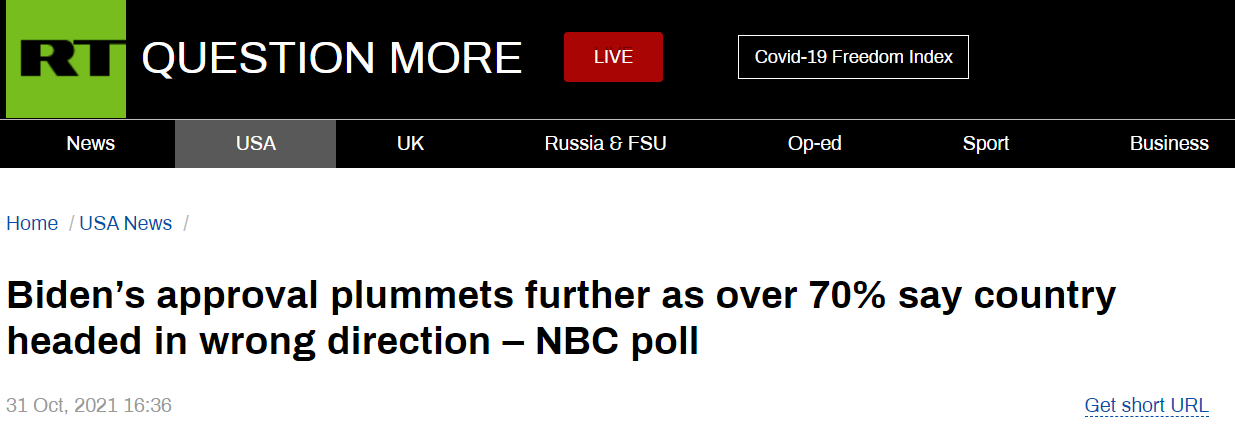 RT称,随着拜登政府处理许多问题,拜登的支持率下降。这些问题包括美国边境地区创纪录的移民数量、新冠疫情和有争议的疫苗规定,以及导致多个行业运行中断的供应链等问题。