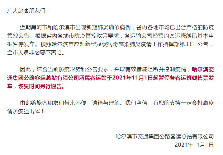 据哈尔滨市交通集团公路客运总站有限公司消息,结合当前防疫形势和公告要求,采取有效措施阻断并控制疫情,哈尔滨交通集团公路客运总站有限公司所属客运站于2021年11月1日起暂停各客运班线售票发车,恢复时间另行通告。