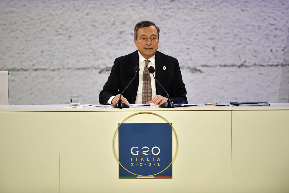 10月31日,在意大利罗马,二十国集团轮值主席国意大利总理德拉吉在闭幕新闻发布会上讲话。(新华社发)