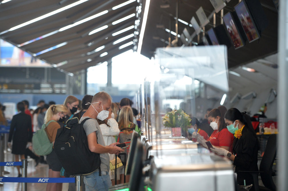 据法新社报道,在曼谷素万那普机场和普吉岛机场,身着防护服的工作人员当天清晨开始为入境游客办理相关手续。