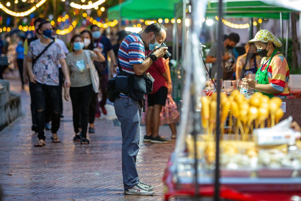 10月15日,一名游客在泰国曼谷翁昂运河步行街拍照。(新华社记者王腾摄)