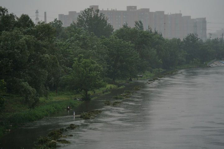 7月12日,在北京市大兴区亦庄镇凉水河畔,河水漫上河两侧的步道。新华社记者 彭子洋 摄