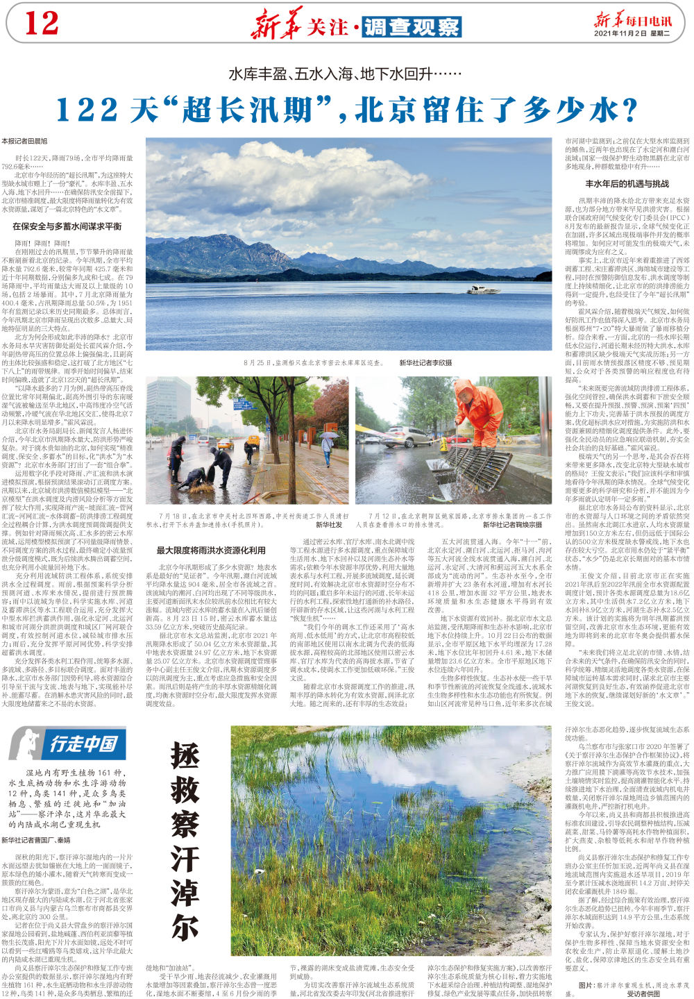 据北京市水文总站监测,北京市2021年汛期降水形成了50.04亿立方米水资源量,其中地表水资源量24.97亿立方米,地下水资源量25.07亿立方米。北京市水资源调度管理事务中心副主任王俊文介绍,汛期水资源调度多以防汛调度为主,重点考虑应急措施和安全因素。而汛后则是将产生的丰厚水资源精细化调度,均衡水资源时空分布,最大限度发挥水资源调度效益。