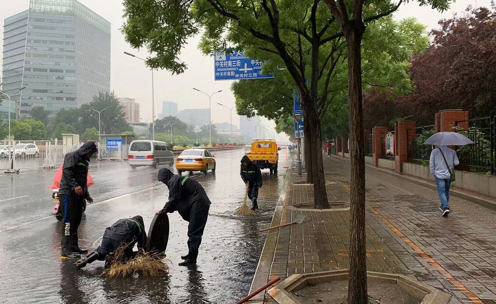 7月18日,在北京市中关村北四环西路,中关村街道工作人员清扫积水,打开下水井盖加速排水(手机照片)。新华社发。