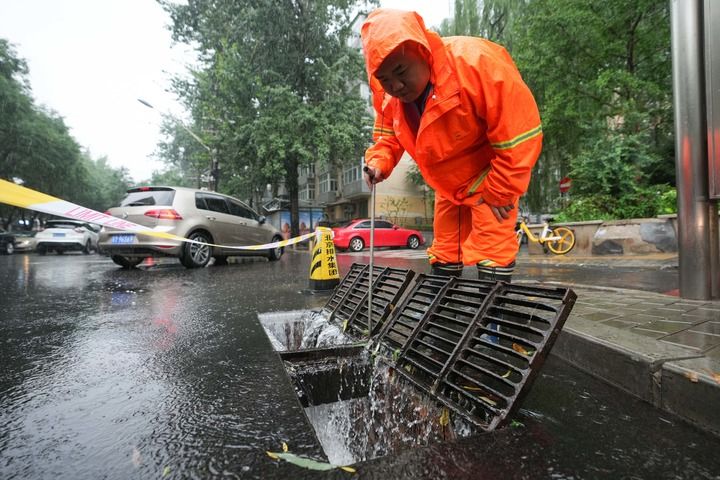 7月12日,在北京市朝阳区姚家园路,北京市排水集团的一名工作人员在查看排水口的排水情况。新华社记者 鞠焕宗 摄