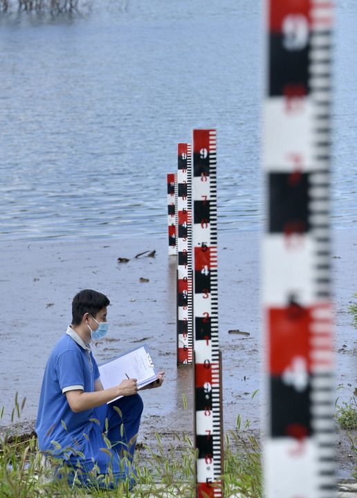 北京市水务局密云水库管理处二甲峪管理站的工作人员在进行水位监测。(8月25日摄)新华社记者 李欣 摄