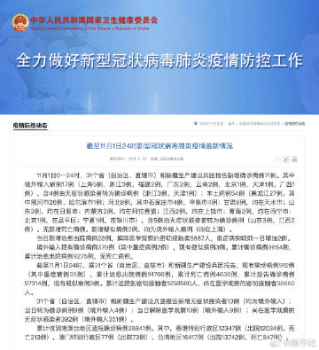 截至11月1日24时,据31个省(自治区、直辖市)和新疆生产建设兵团报告,现有确诊病例912例(其中重症病例35例),累计治愈出院病例91766例,累计死亡病例4636例,累计报告确诊病例97314例,现有疑似病例3例。累计追踪到密切接触者1258560人,尚在医学观察的密切接触者38660人。