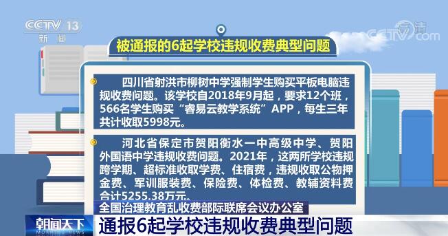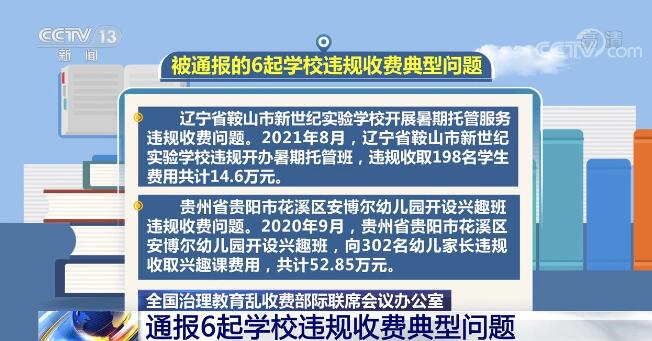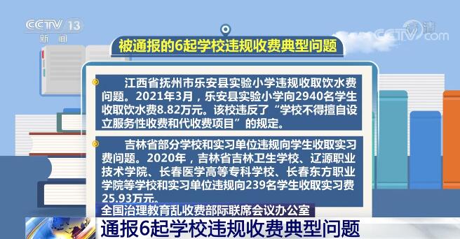 央视网消息:全国治理教育乱收费部际联席会议办公室日前对6起学校违规收费典型问题查处情况进行了通报,并要求各地要从典型问题中吸取教训,进一步加强和规范教育收费管理。