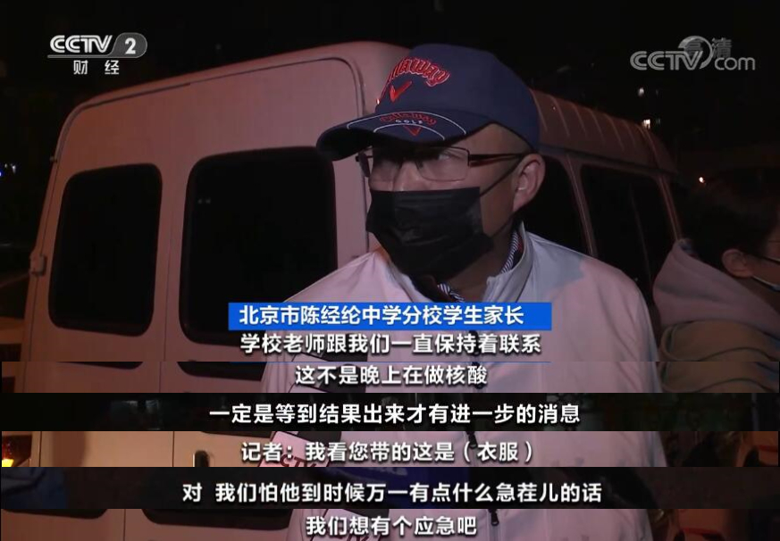 记者 宁坤:这里是北京市陈经纶中学分校的门口,现在时间已经是11月2日的凌晨12时30分。在校门口,我们刚才看到已经有一些家长收到通知,带着行李从家里赶过来,进到校区内准备陪同孩子一同(去酒店)隔离。还有一些家长收到的通知是将衣物准备好,送到学校门口交接给里面的老师。另外,还有一些家长仍然在学校门口等待进一步的通知。