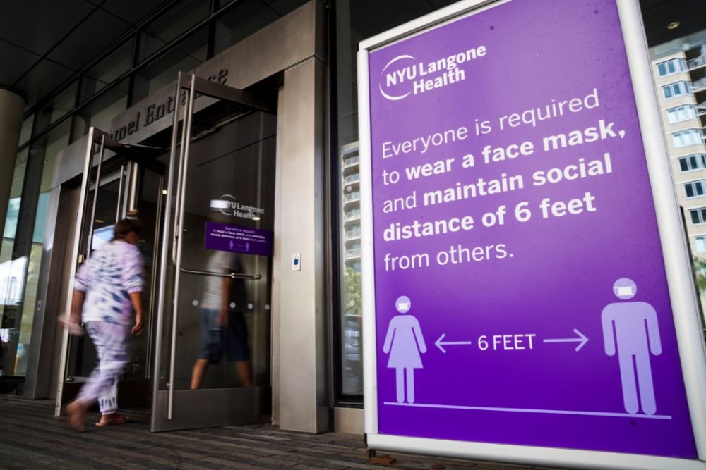 9月6日,人们走过美国纽约一家医院的防疫提示牌。(新华社记者王迎摄)