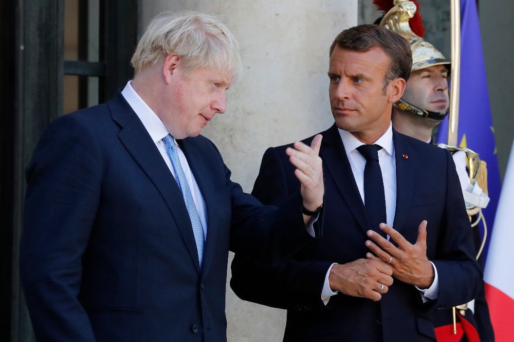 2019年8月22日,在法国巴黎,法国总统马克龙(右)与来访的英国首相约翰逊交谈。(新华社发,杰克·陈摄)