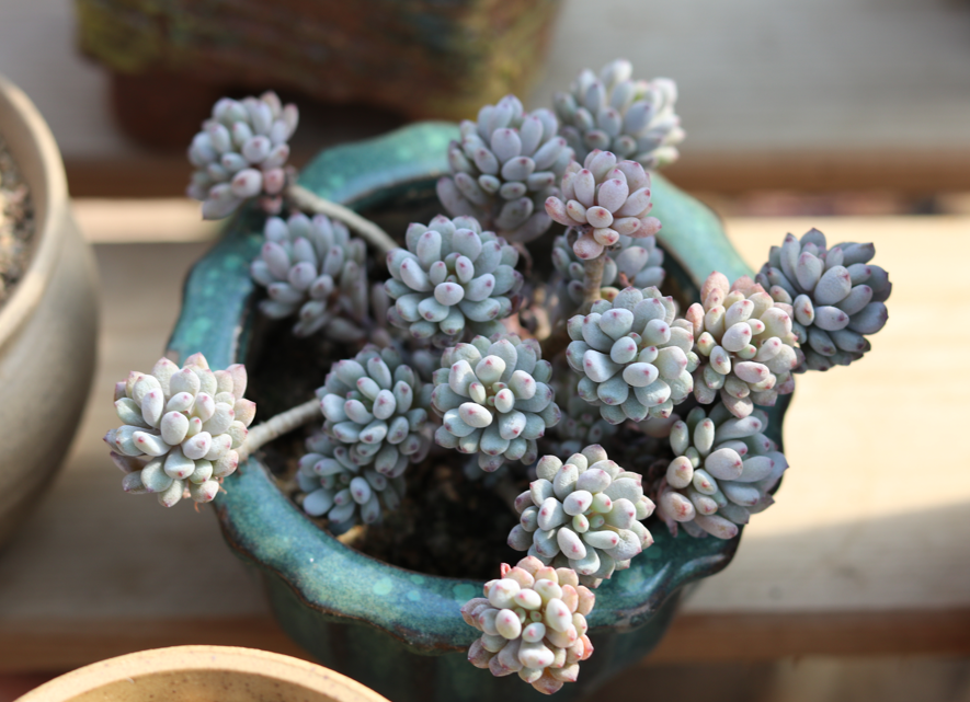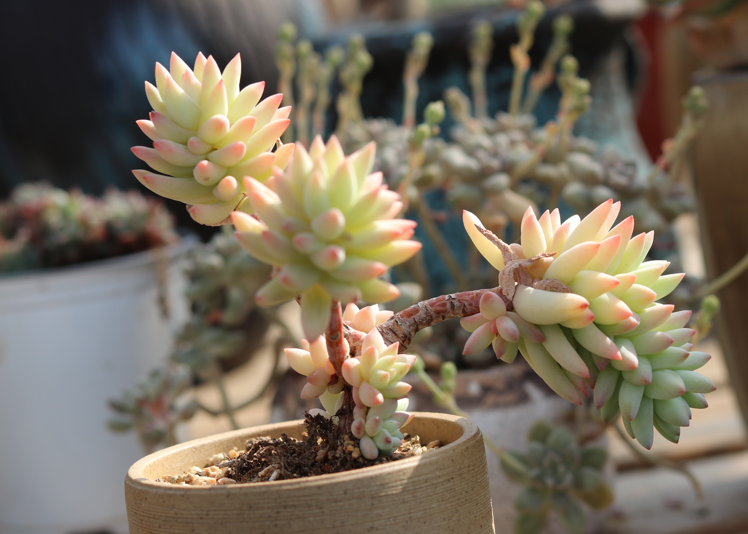 多肉植物它品种非常的多,颜色各异,有的花友刚刚开始接触多肉,去买多肉的时候看着漂亮你就买回来了,记住,漂亮的多肉有很多是不靠谱的,比如我们常见的那种药锦的多肉,药锦多肉都是大棚里栽培好了准备拿到市场上卖的时候提前去喷一下药,喷了药以后整个植株中间就会变为一种粉色或者是白色,感觉就像出了锦一样,这种多肉你拿回家里去放到一个不见光的地方能够保持两个月甚至三个月的时间,如果放到太阳底下去,一个月都到不了,整个植株就会干枯而死。