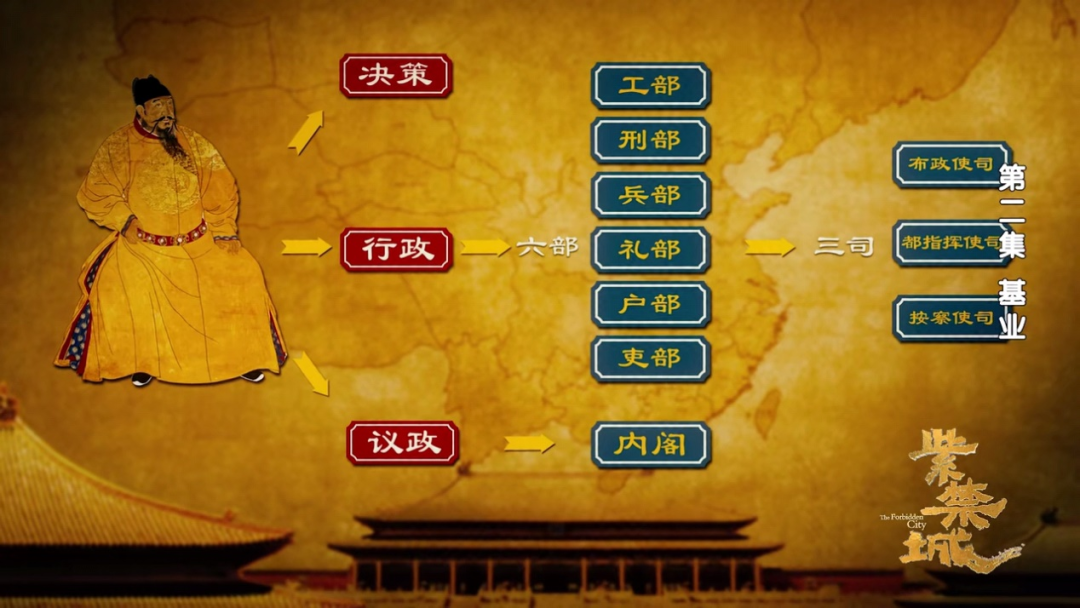 以文渊阁带出朱棣对宰相制度的革新,这是对明朝政治的侧写。明朝的文渊阁(今文华殿南侧)不仅有储存图书典籍的职能,还是文官集团的议政中心。朱棣继承了朱元璋的治国理念(废除宰相制),但改进了这种机制。他选拔翰林院部分官员,任命为殿阁大学士,在文渊阁日常值班,参与政务,这个常设机构被称之为“内阁”。