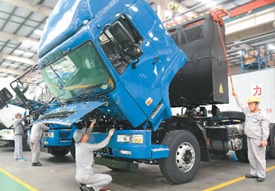 今年前10个月,安徽省马鞍山经开区汉马科技集团抢抓新能源商用车发展机遇,销售具有自主知识产权的搅拌车、牵引车和自卸车等新能源重卡达977辆。图为11月2日,该集团员工在安装纯电动搅拌车的可换电电池箱。 胡智慧摄(人民视觉)