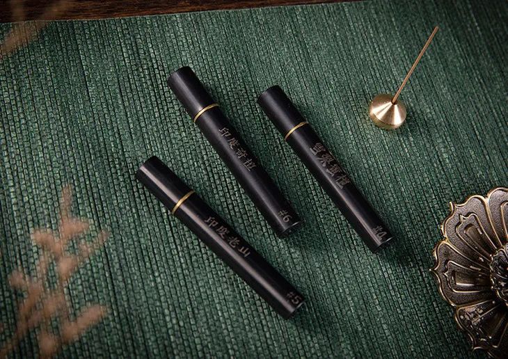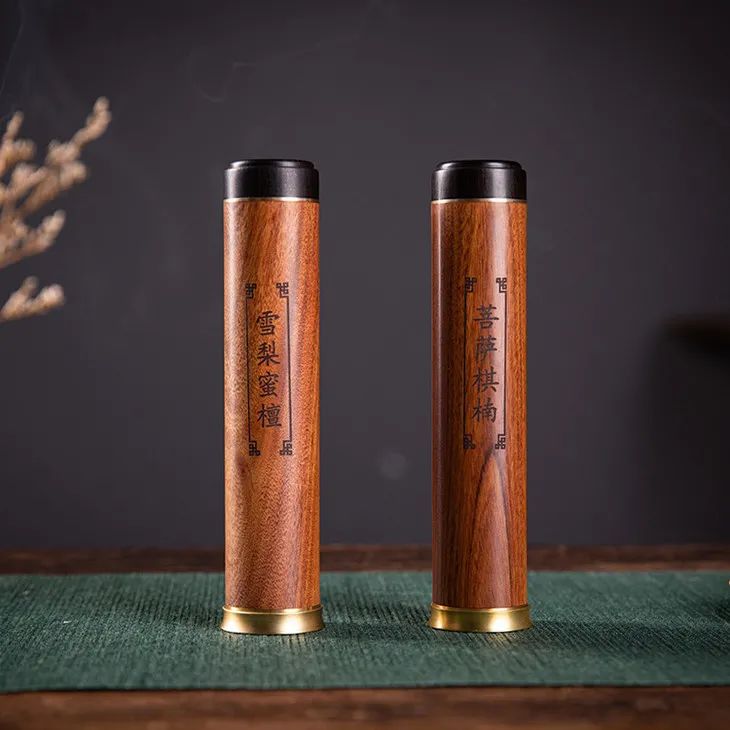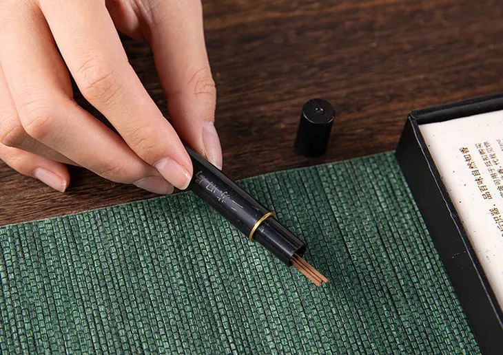 每款约120-150支,装入花梨木香管中,黑檀盖、黄铜底座点缀,尽显古朴雅致之气。