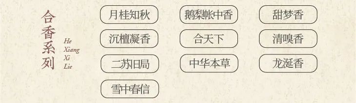 合香系列 :月桂知秋、沉檀凝香、二苏旧局、雪中春信、鹅梨帐中香、合天下、中华本草、甜梦香、清嗅香、龙涎香